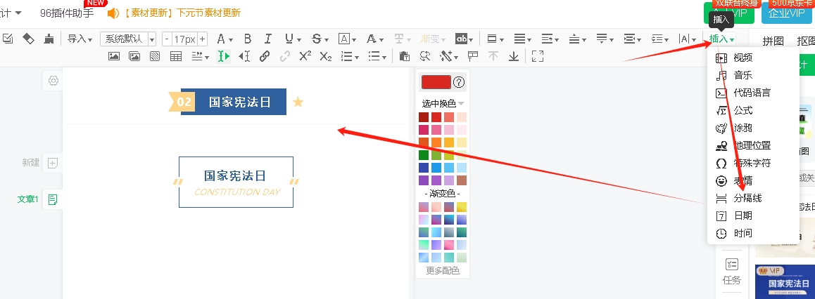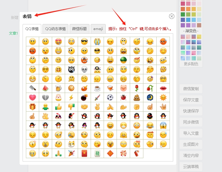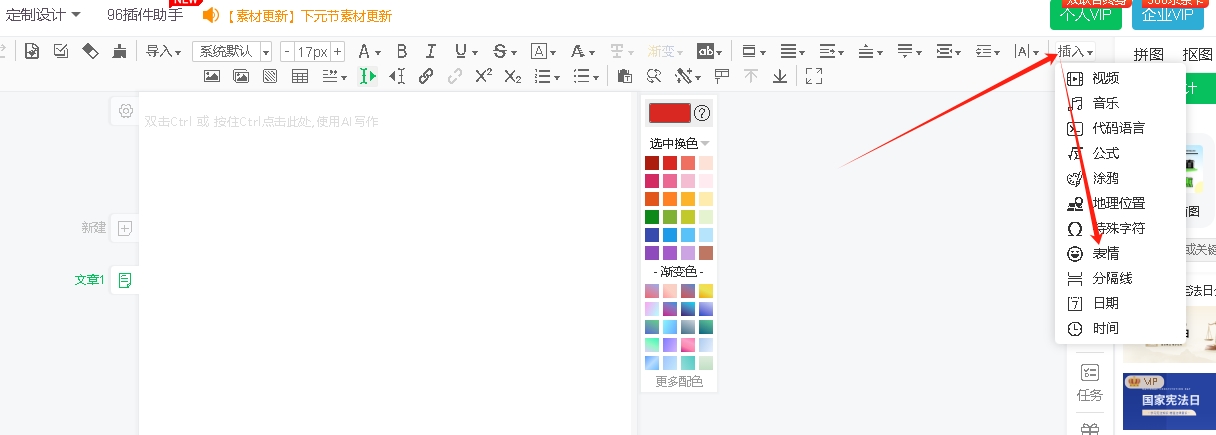 需要在文章添加表情时,点击插入—表情,选择喜欢的表情插入到文章中,微信标题类的表情可以插入到公众号标题里面。