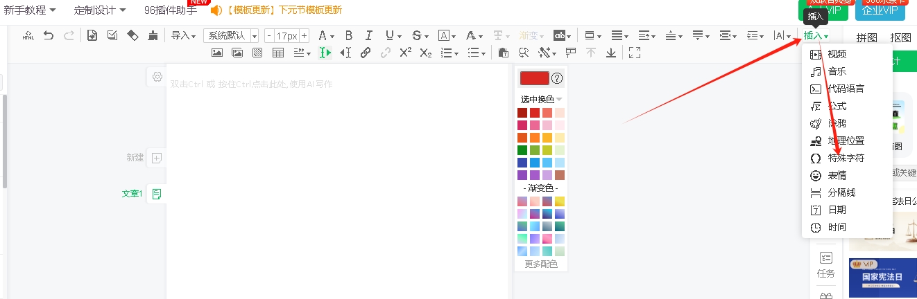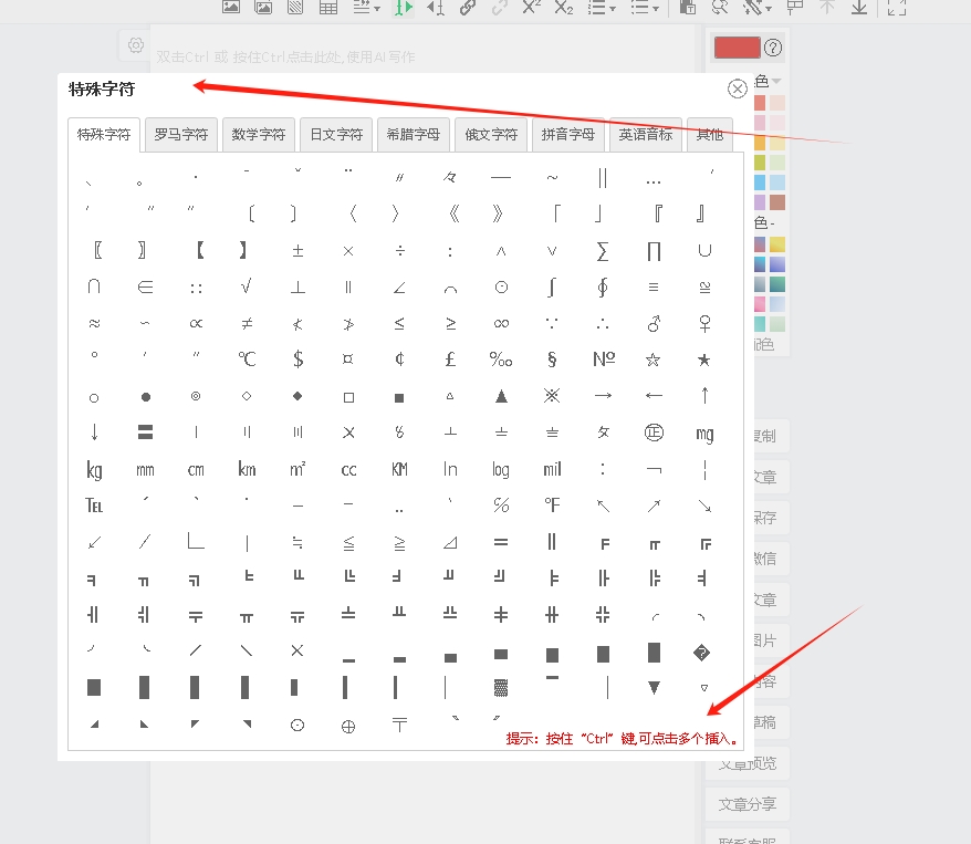 在编辑文字中需要添加特殊符号,可以点击插入—特殊字符,选择需要的符号插入到文章中。