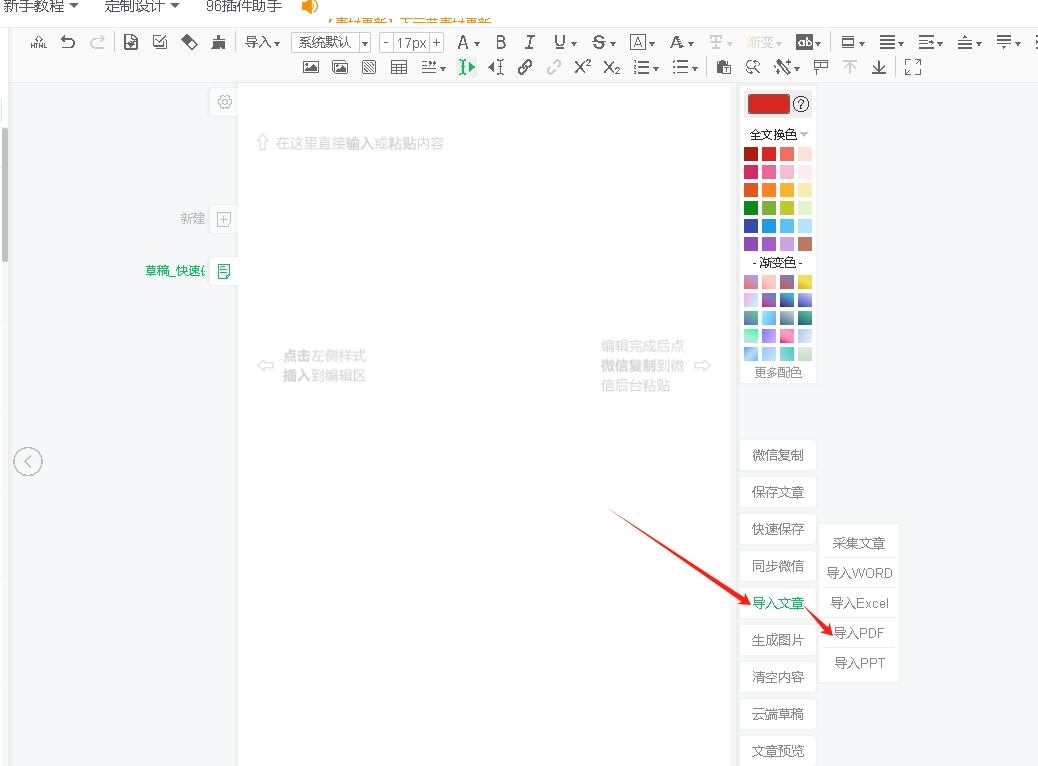 第一步:鼠标放到导入文章,不要点击,会出现导入PDF选项,鼠标点击。