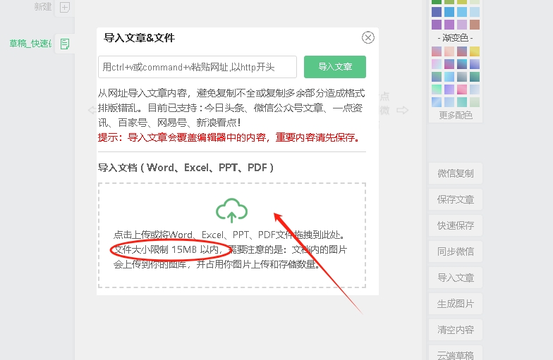第二步:点击上传或将PDF文件拖拽到此处。文件大小限制15MB以内。
