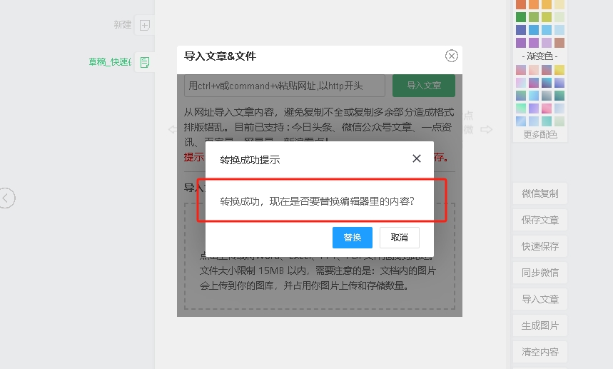转换成功后,点击替换,PDF中的内容将会上传到编辑区中,可以继续进行编辑。