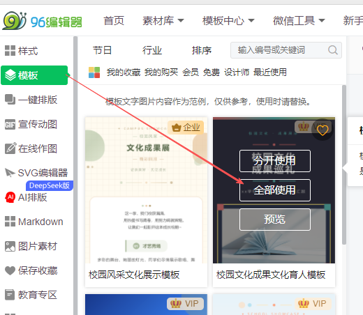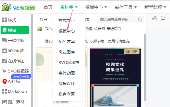 导航栏选择【素材库-模板中心】—输入模板关键词——点击【搜索】即可已找到想要的模板