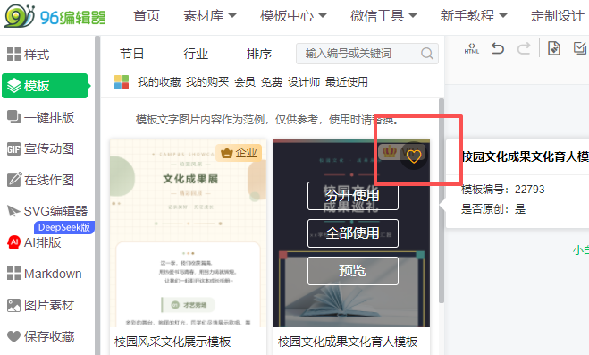 【模板中心】—查找喜欢的模板—点击【♡】收藏