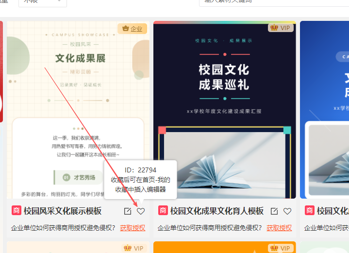 鼠标放到左侧选择的模板上,右下角会显示一个黄色的心,点击【♡】收藏