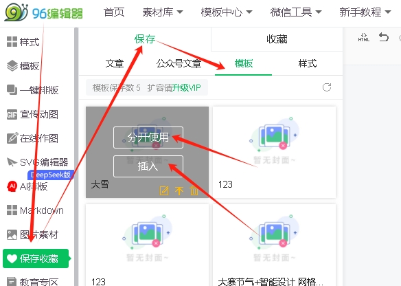 首页左侧【保存收藏】—【保存】—【模板】—点击【分开使用】或【插入】