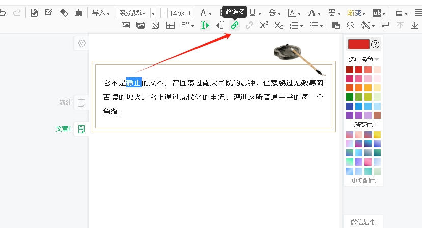 2.选中需要添加内链的文字,点击输入链接,粘贴文章链接,点击完成。