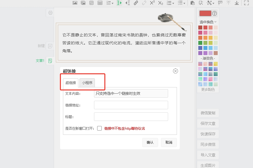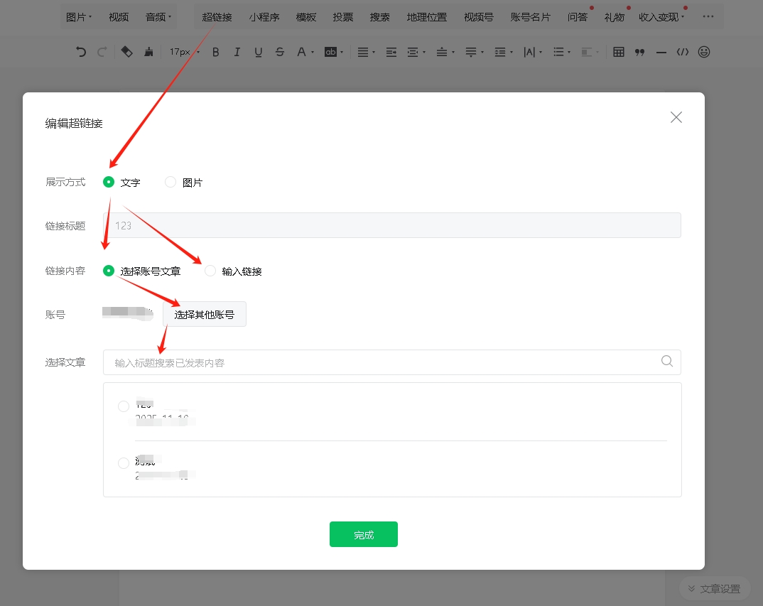 1.选中需要添加内链的文字,点击选择账号文章,使用自己的公众号或者选择其他账号,输入标题搜索已发表内容,选择需要链接的文章,点击完成。