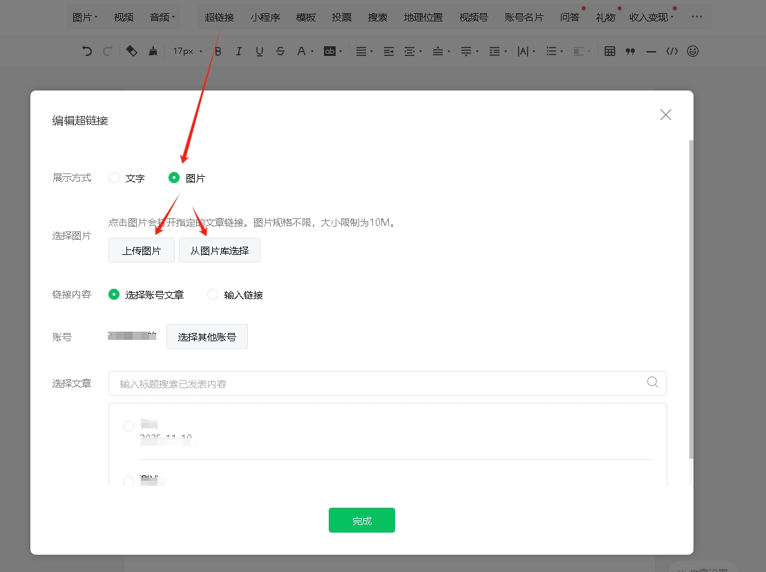 3.点击超链接,点击图片,选择上传图片或从图片库选择,选择账号文章,使用自己的公众号或者选择其他账号,输入标题搜索已发表内容,选择需要链接的文章,点击完成。