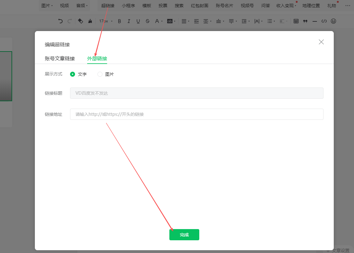 点击外部链接,选择文字或图片,输入链接标题和地址,点击完成。