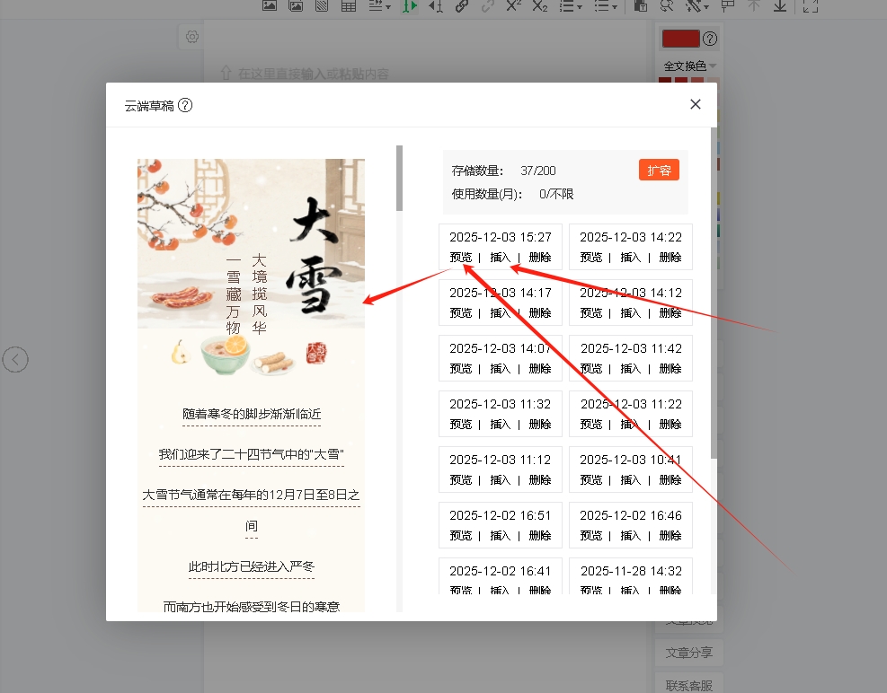 您只需重新进入编辑器,打开云端草稿,即可查看自动备份的历史版本,并将其一键插入编辑区进行恢复和继续编辑。。