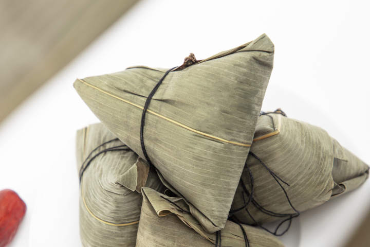 将粽子煮熟,放在透明的盘子中晾凉。待粽子完全凉透之后,将冰块用刨冰机刨成冰花铺在凉透的粽子上,然后在冰沙上放一些红豆沙,甚至还可以浇上一点自己喜欢的果汁。