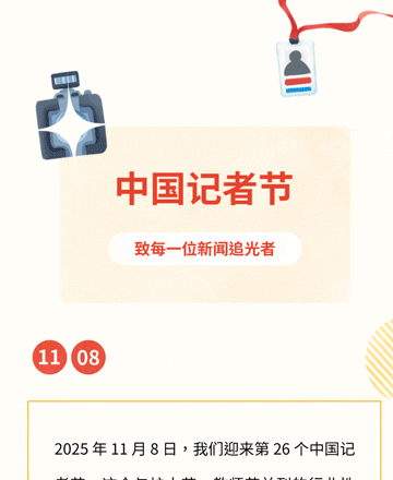 中国记者节,为每一位时代的记录者而设。他们以笔为剑,以镜为窗,穿梭于新闻现场,记录社会变迁,传递时代强音。在喧嚣中探寻真相,在平凡中发现伟大。这个节日,是对新闻人责任与坚守的致敬,亦是对事实与公信的礼赞。愿初心不渝,笔下生辉。