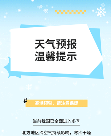 清晨最低气温跌入冰点或以下,注意提前给水管、车辆等做好防冻处理,老人小孩外出时间不宜过早。